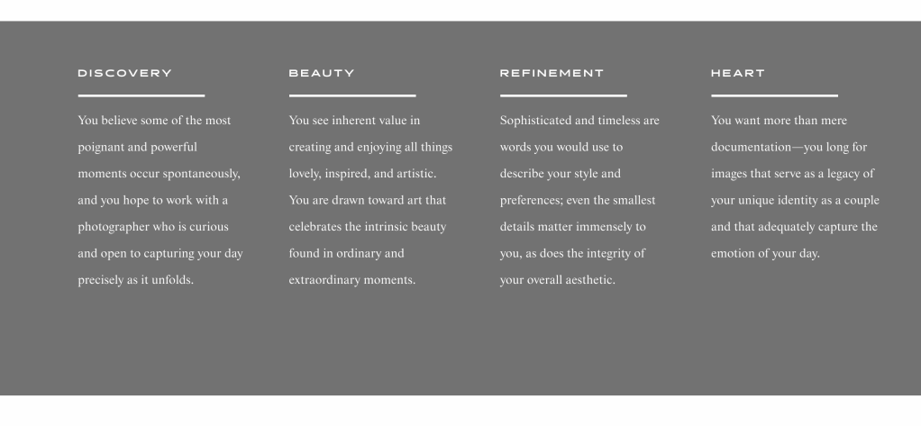 For his about page, nationally recognized photographer Brett Heidebrecht wanted copy that complemented the style of his photography: formal and art-driven, with a touch of warmth and approachability. I love how it turned out. View his full about page here.